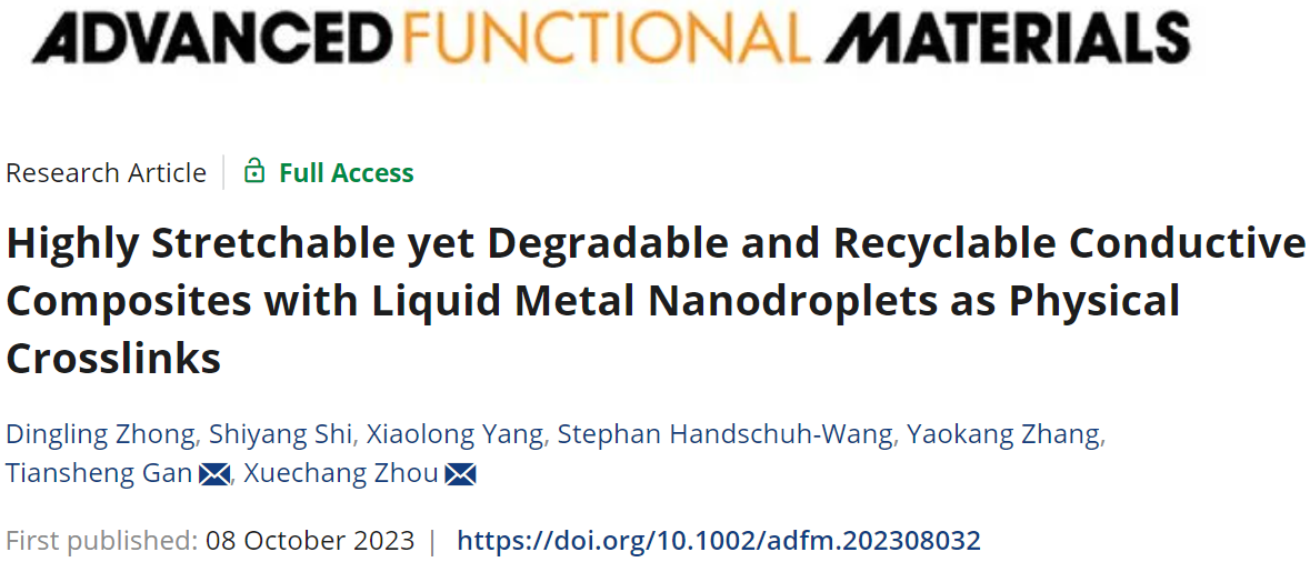 D. Zhong, S. Shi, X. Yang, S. Handschuh-Wang, Y. Zhang, T. Gan*, X. Zhou*, Highly Stretchable yet Degradable and Recyclable Conductive Composites with Liquid Metal Nanodroplets as Physical Crosslinks. Adv. Funct. Mater. 2023, 2308032.