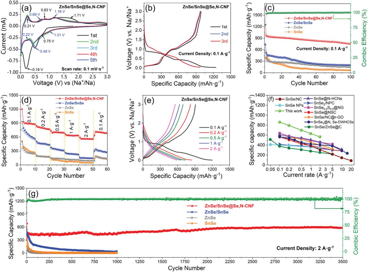 In this article, ZnSn(OH)6 nanobox precursors were first electrospunned with polyacrylonitrile (PAN) to obtain a 3D free-standing network, after thermal treatments with carbonization and selenylation, ZnSe/SnSe heterostructures embedded in the Se/N co-doped CNF skeleton have been developed (ZnSe/SnSe@Se,N-CNFs). The unique ZnSe/SnSe heterostructures, electrospun CNF and Se/N co-doped characteristics can effectively promote electron/Na+ diffusion rate, enhance the structure stability, and accelerate the electrochemical reaction kinetics: I) The hetero-boundaries in the ZnSe/SnSe will provide enhanced interfacial coupling effect and built-in electric field with additional charge-transfer driving force, which can attract more Na+ ions to adsorb in the heterogeneous interfaces and improve the migration rate of Na+ ions from electrolyte to electrode, thereby effectively accelerating the electrochemical kinetics. II) The 3D free-standing CNF network embedded with ZnSe/SnSe nanoboxes, can not only enhance the conductivity of semiconductor ZnSe/SnSe but also improve its structure integrity avoiding violent volume expansion/shrinkage during the insertion/extraction process. III) The Se/N co-doping feature achieves a coupling effect between the CNF matrix and the selenide heterostructures, enabling fast ion/electron transport and accelerating surface/internal reaction kinetics for Na-ion storage, and enhancing the electronic conductivity and wettability of the CNF matrix. This research gives some inspiring design ideas for addressing the current challenges of alloy-based materials when applying in sodium-ion batteries: The electrical conductivity has been enhanced by hetero-nanostructure construction, carbon-shell coating, and co-doping modification strategies; and volume expansion issue has been addressed by embedding alloyed materials into carbon matrix with 3D free-standing skeleton feature.