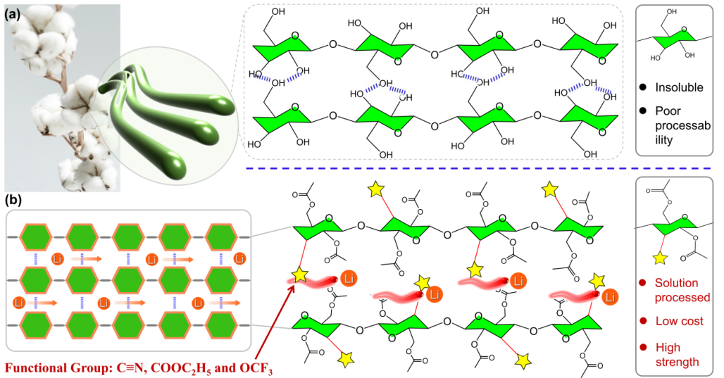 Ruixue Wang, Weiliang Dong, Zhennuo Song, Jiji Tan, Qiang Liu, Kexin Mu, Weijian Xu, Haiyu Huang, Zhili Zhang, Gang Yin, Caizhen Zhu, Jian Xu, and Lei Tian*, Ion-Conducting Molecular-Grafted Sustainable Cellulose Quasi-Solid Composite Electrolyte for High Stability Solid-State Lithium-Metal Batteries.Adv. Funct. Mater.2024, 2402461.