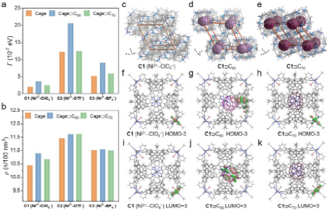 Figure 4. (a, b) Electrode-molecule coupling (Γ, estimated through fitting the experimental J-V data with the single energy level model) and packing density (ρ) of metallo-supramolecular ensembles with different counteranions. (c-e) Simplified packing modes of C1, C1ÉC60, and C1ÉC70 to estimate packing density shown in Figure 6b (hydrogen atoms, solvents and disordered counteranions are omitted for clarity). The modes are extracted by connecting the centroids of eight adjacent octahedral assemblies. (f-h) HOMO-3 of C1, C1ÉC60, and C1ÉC70. (i-k) LUMO+3 of C1, C1ÉC60, and C1ÉC70.