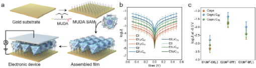 Figure 3. Electrical conductivity study of metallo-cages and cage-fullerene complexes at aggregated state in the form of assembled films. (a) Scheme of electronic device fabrication. (b, c) log|J|-V curves (b) and plots of log|J| at -0.5 V (c) for the assembled films of metallo-supramolecular ensembles with different counterions.