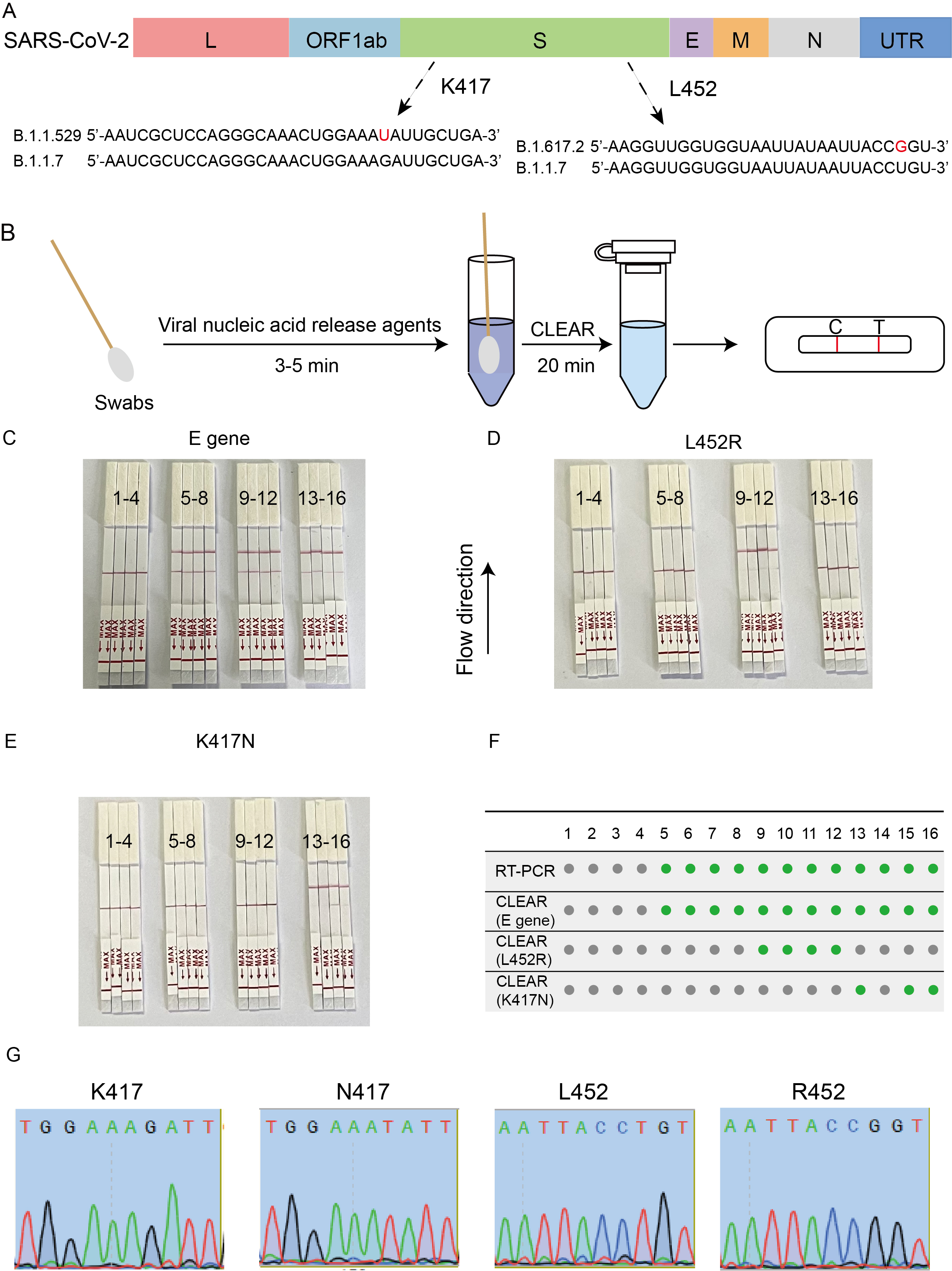 3.Accurate Typing Detection: Utilizing programmable crRNA design, this system accurately identifies single nucleotide mutations, such as K417N, K417T, and L452R, enabling non-amplification-based typing of SARS-CoV-2 variants. The CLEAR system demonstrated excellent performance in typing both standard and clinical samples, highlighting its potential for detecting various respiratory pathogens.