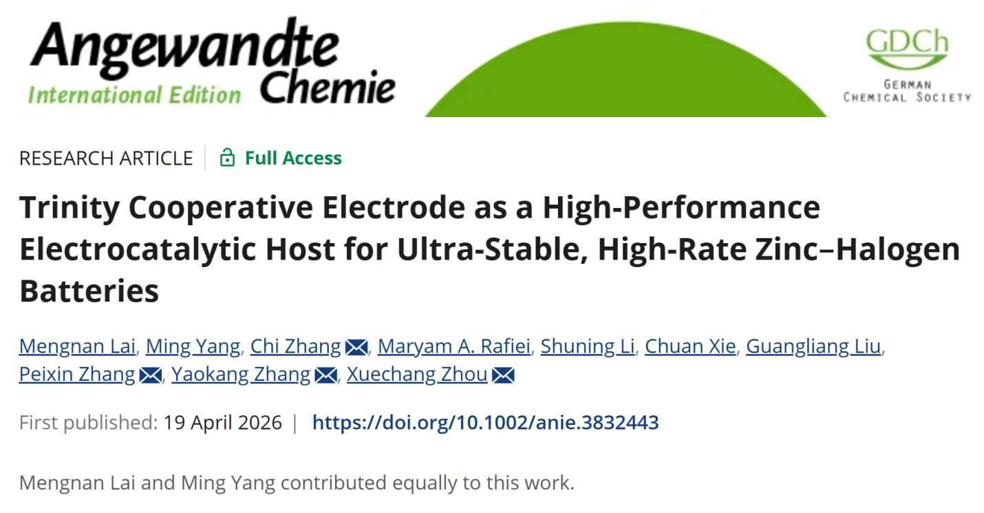 论文信息:Mengnan Lai#, Ming Yang#, Chi Zhang*, Maryam A. Rafiei, Shuning Li, Chuan Xie, Guangliang Liu, Peixin Zhang*, Yaokang Zhang*, Xuechang Zhou*. Trinity Cooperative Electrode as a High-Performance Electrocatalytic Host for Ultra-Stable, High-Rate Zinc–Halogen Batteries, Angewandte Chemie International Edition, 2026. //doi.org/10.1002/anie.3832443