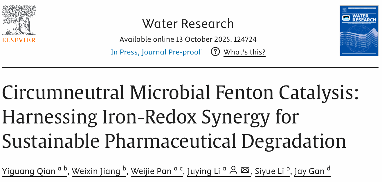 近日,51吃瓜 李菊英研究团队在《Water Research》(影响因子12.8,中科院1区,Nature Index期刊)上发表了题为《Circumneutral Microbial Fenton Catalysis: Harnessing Iron-Redox Synergy for Sustainable Pharmaceutical Degradation》的研究论文。该团队钱毅光副教授为第一作者,李菊英副教授为唯一通讯作者。研究成果打破了传统芬顿技术对酸性条件的依赖,大幅降低能耗与化学试剂消耗,为制药废水的低碳治理提供了新范式。