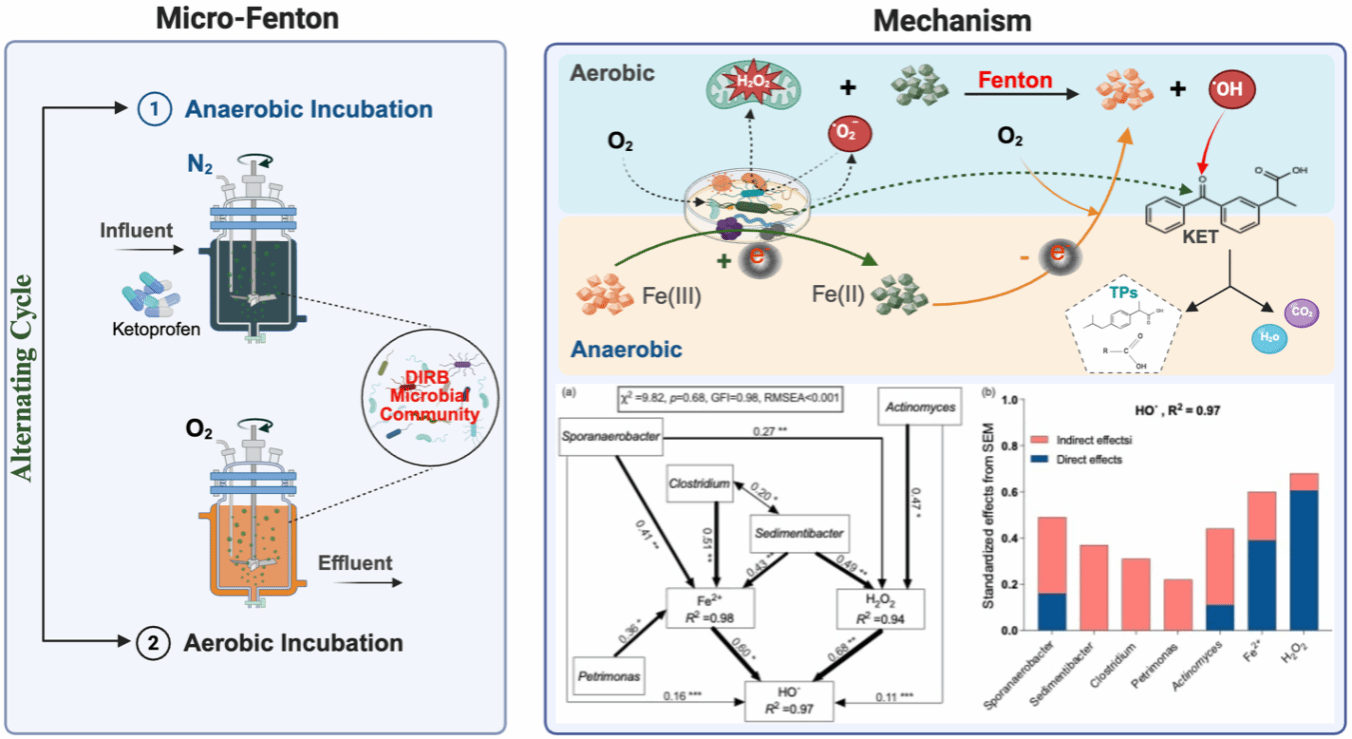 该研究构建一种受自然启发的微生物群落驱动的自维持MFenton系统,在近中性环境下实现药物类新污染物的高效降解(>80%)。该MFenton系统通过厌氧-好氧交替循环,促使异化铁还原菌群(关键菌属包括SporanaerobacterSedimentibacterClostridiumPetrimonasActinomyces等),自主完成“Fe3+ 还原为 Fe2+”(厌氧阶段)和 “H2O2生成”(好氧阶段),进而原位持续产生HO˙。与传统芬顿工艺相比,本系统通过关键菌群的协同作用实现铁氧化还原循环的自维持,无需调节pH、能耗降低75%以上,且无外源化学试剂投加,具备良好的环境适应性与可持续性。本研究成果重新界定了微生物驱动高级氧化技术的应用边界,为解析自然铁氧化还原网络被工程化改造以实现动态环境中污染物去除提供了机制层面的见解。